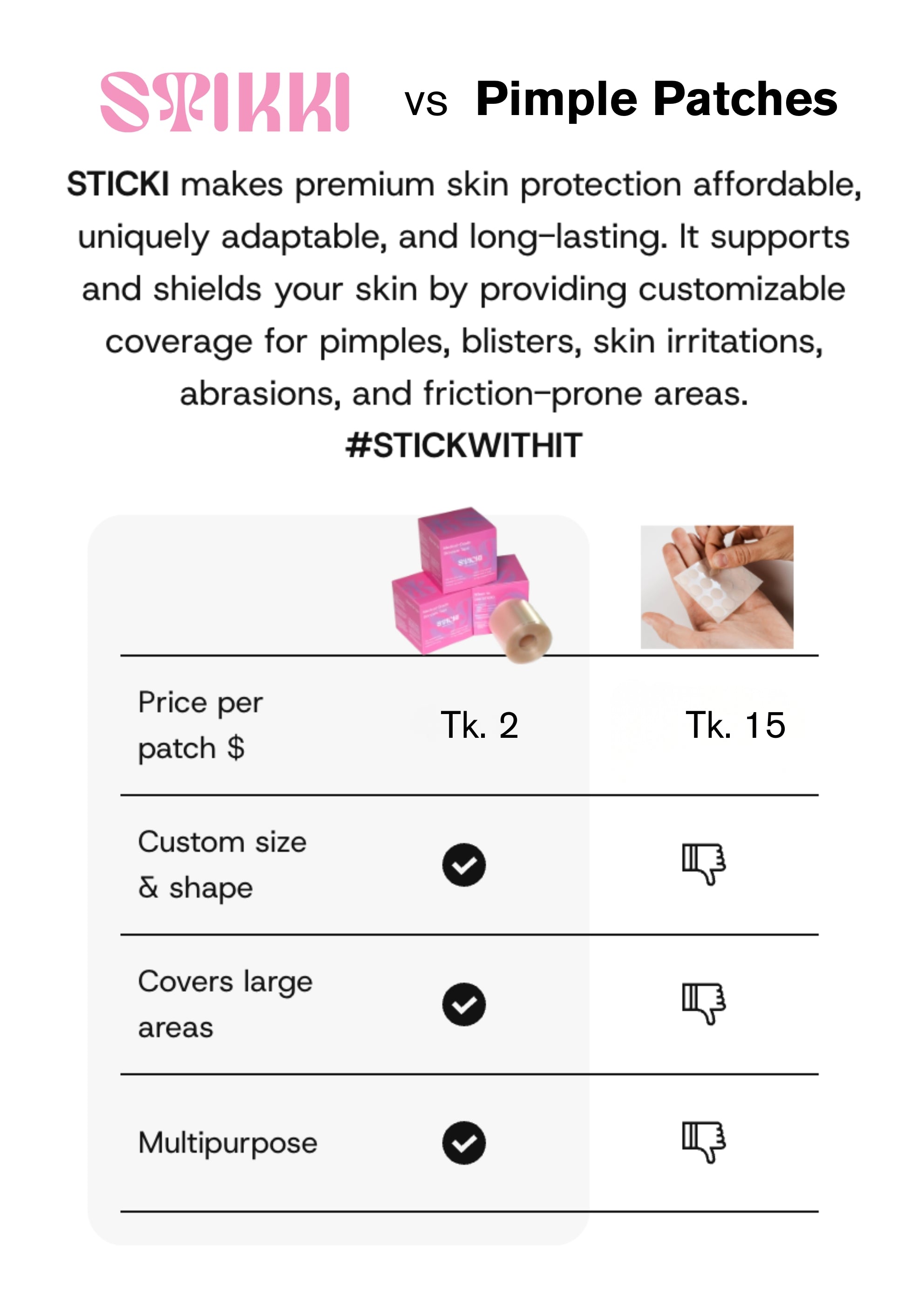 STIKKI is invisible skincare tape(16ft Long) that you cut to fit whatever you need - whether it's zapping a pimple, saving your heels from rubbing, or protecting irritated skin. One roll does it all and lasts forever compared to those overpriced little patches.